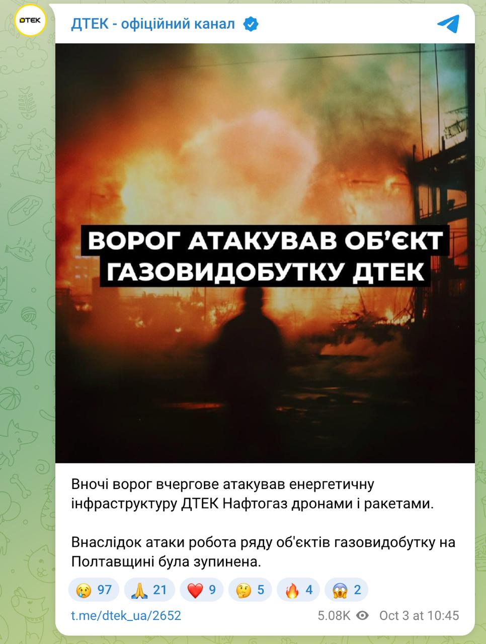 В Полтавской области остановлена работа на объектах газодобычи, сообщает украинская энергокомпания ДТЭК.