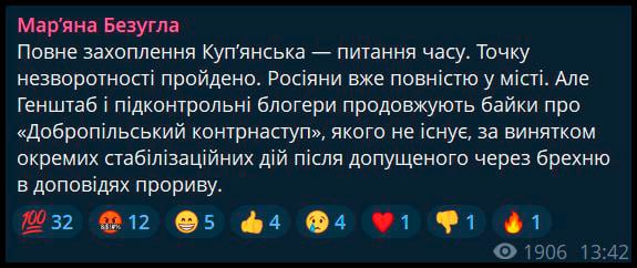 "Полное взятие Купянска - вопрос времени. Точка необратимости пройдена. Россияне уже полностью в городе" — пишет депутат Рады.