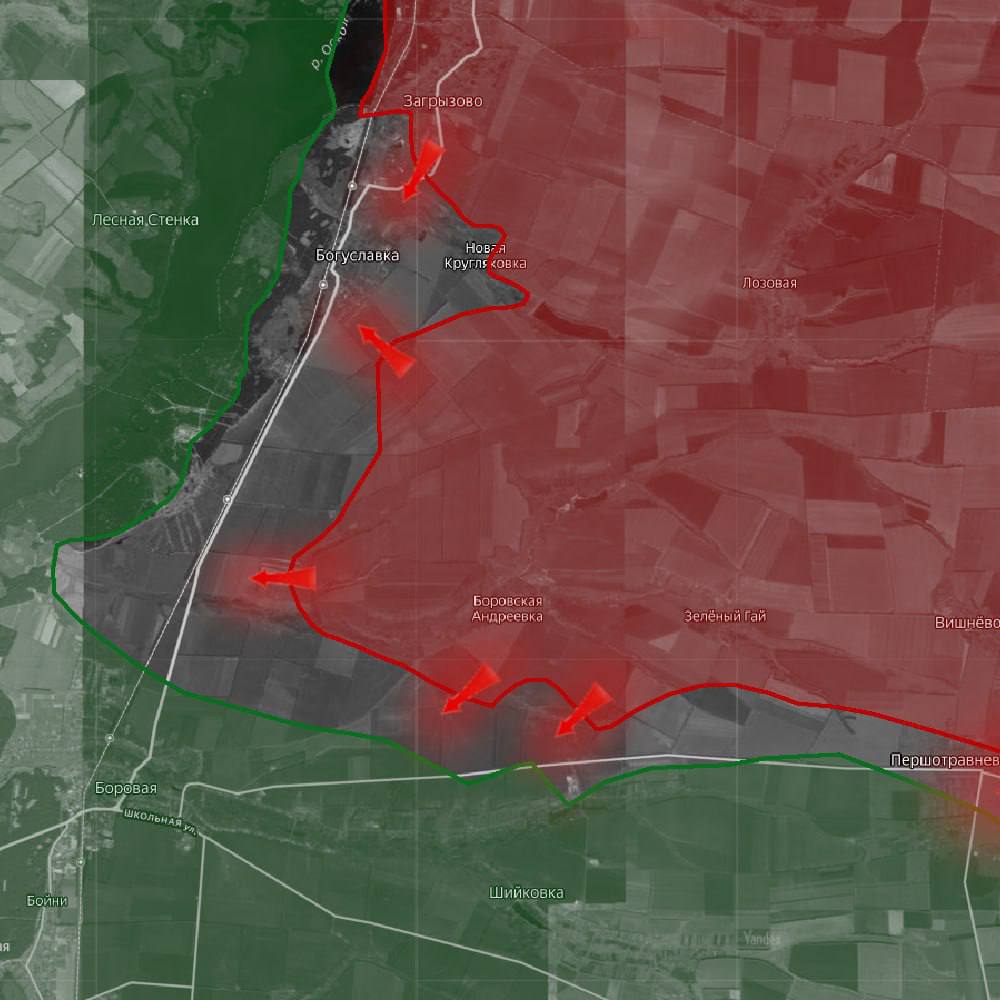 «На Купянском направлении ВС РФ продолжают наступление в лесном массиве в районе н.п. Богуславка. Также продвижение российских войск фиксируется южнее населенного пункта Новоплатоновка в направлении Боровой»