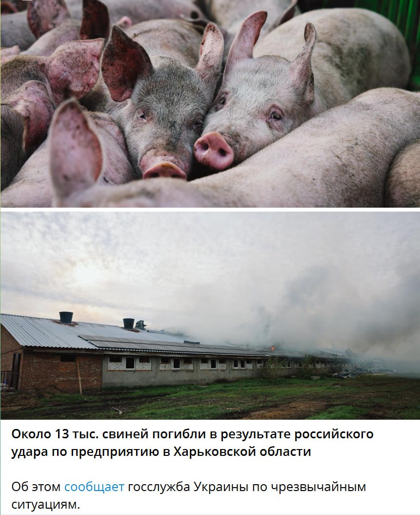 P.S. А вообще, конечно, поражает воображение эффективность наших ударов — 13 тысяч свиней можно уничтожить одним ударом БПЛА! Тем более, судя по фоткам, свиноферма почти вся уцелела. Зато (вспоминаем советскую классику) очень легко можно «списать» часть поголовья и тупо украсть, что, скорее всего, ушлые сотруднички фермы и сделали)