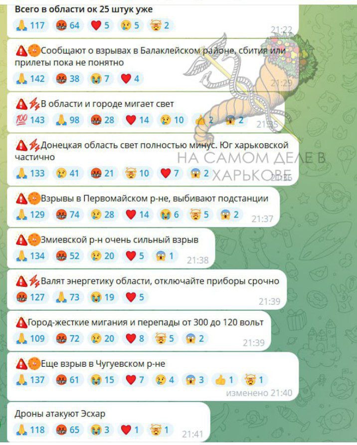 В Харьковской области сообщают о множественных прилётах в Змиевском, Чугуевском и Первомайском районах. Взрывы слышали и в Балаклейском. Во многих районах пропал свет