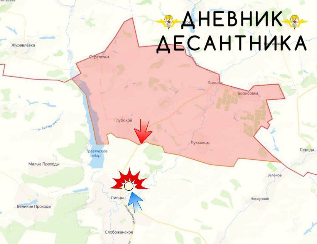 На данном участке фронта наши расчеты БПЛА наносят удары огневое поражение по ПВД противника в Липцах и его окрестностях.