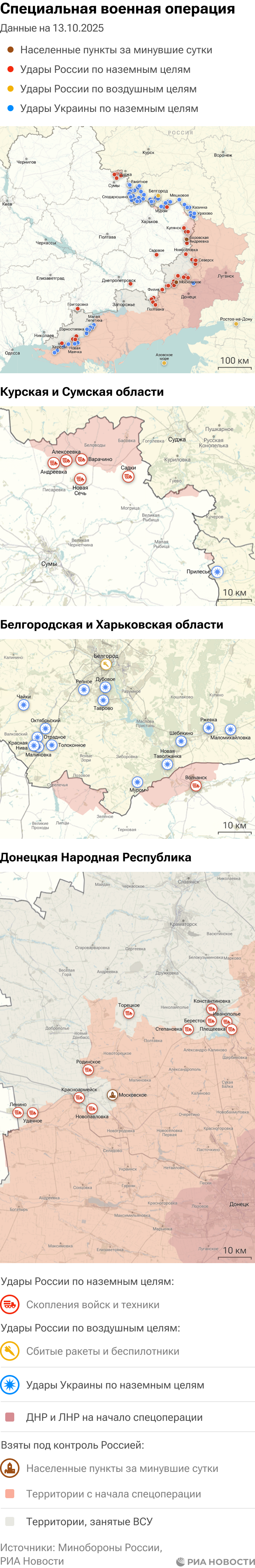 Российская армия с 24 февраля 2022 года проводит на Украине специальную военную операцию. Ее главной целью является помощь Донецкой и Луганской народным республикам, на территории которых с 2014 года не прекращались обстрелы. Перед российскими военными поставлена задача минимизировать потери личного состава и мирного населения при выполнении боевых заданий.Данные Минобороны и администраций новых регионов на 13 октября 2025 года
