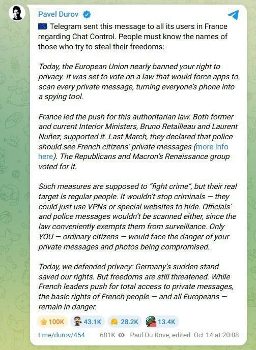 Павел Дуров заявил, что власти Франции стремятся получить доступ к личной переписке граждан через инициативу Chat Control. По его словам, Telegram направил предупреждение французским пользователям о возможной угрозе конфиденциальности. Законопроект предусматривает обязательное сканирование всех сообщений в мессенджерах, что фактически превращает телефоны в инструменты слежки. Особую обеспокоенность вызывает то, что меры не затронут переписку чиновников и полиции, в то время как данные обычных пользователей окажутся под угрозой.