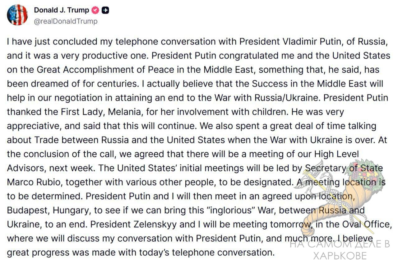 -Москва и Вашингтон незамедлительно начнут подготовку встречи Трампа и Путина, которая, «возможно пройдет в Будапеште;
