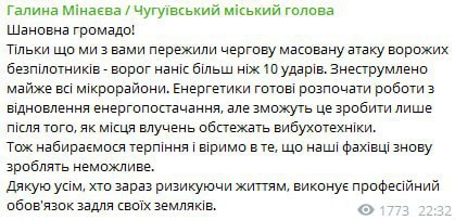Гауляйтер Чугуева подтверждает, что город обесточен после ударов