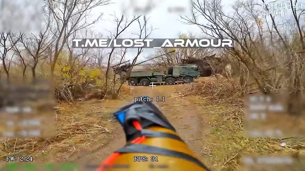 Уничтожение ещё одной 155-мм украинской колёсной САУ 2С22 «Богдана» на шасси Tatra T815-7 ударами оптоволоконных FPV-дронов "КВН" в Харьковской области.