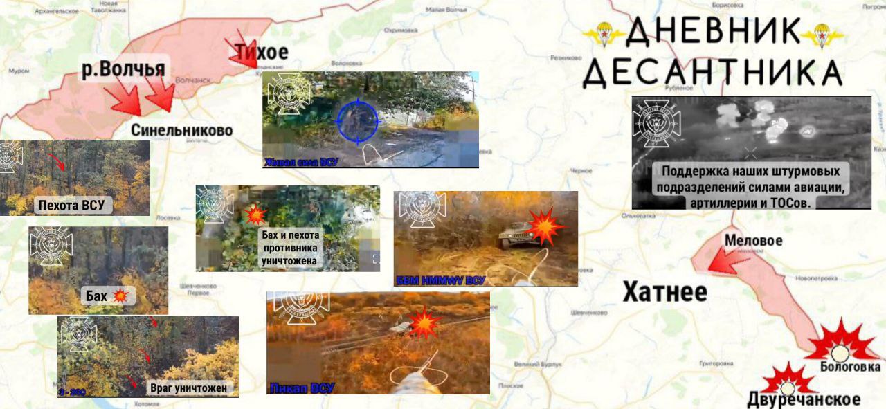Российская армия продвигается от н.п Меловое до н.п Хатнее. Производится зачистка лесопосадок и укрепрайонов по линии соприкосновения, это позволяет в дальнейшем продвинуться южнее. Уничтожены позиции противника в районах Бологовки и Двуречанского силами нашей авиации.