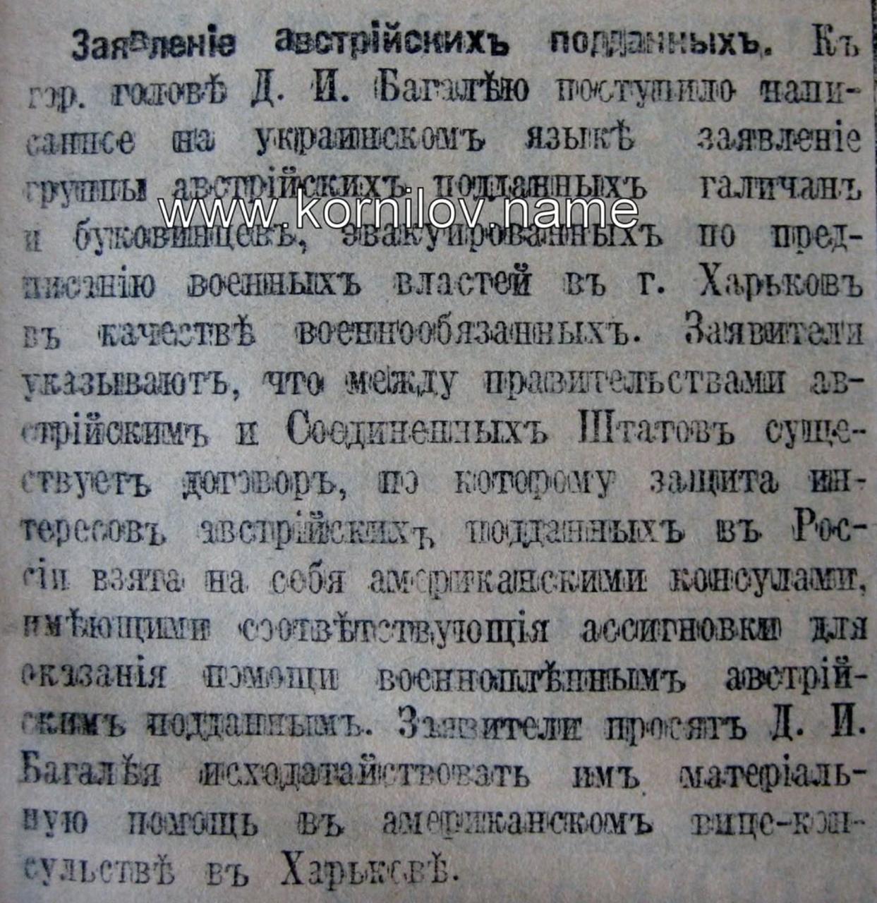 Вот как объясняла это газета «Утро»: «Заявители указывают, что между правительствами австрийским и Соединенных Штатов существует договор, по которому защита интересов австрийских подданных в России взята на себя американскими консулами, имеющими соответствующие ассигновки для оказания помощи военнопленным австрийским подданным. Заявители просят Д.И. Багалея исходатайствовать им материальную помощь в американском вице-консульстве в Харькове».