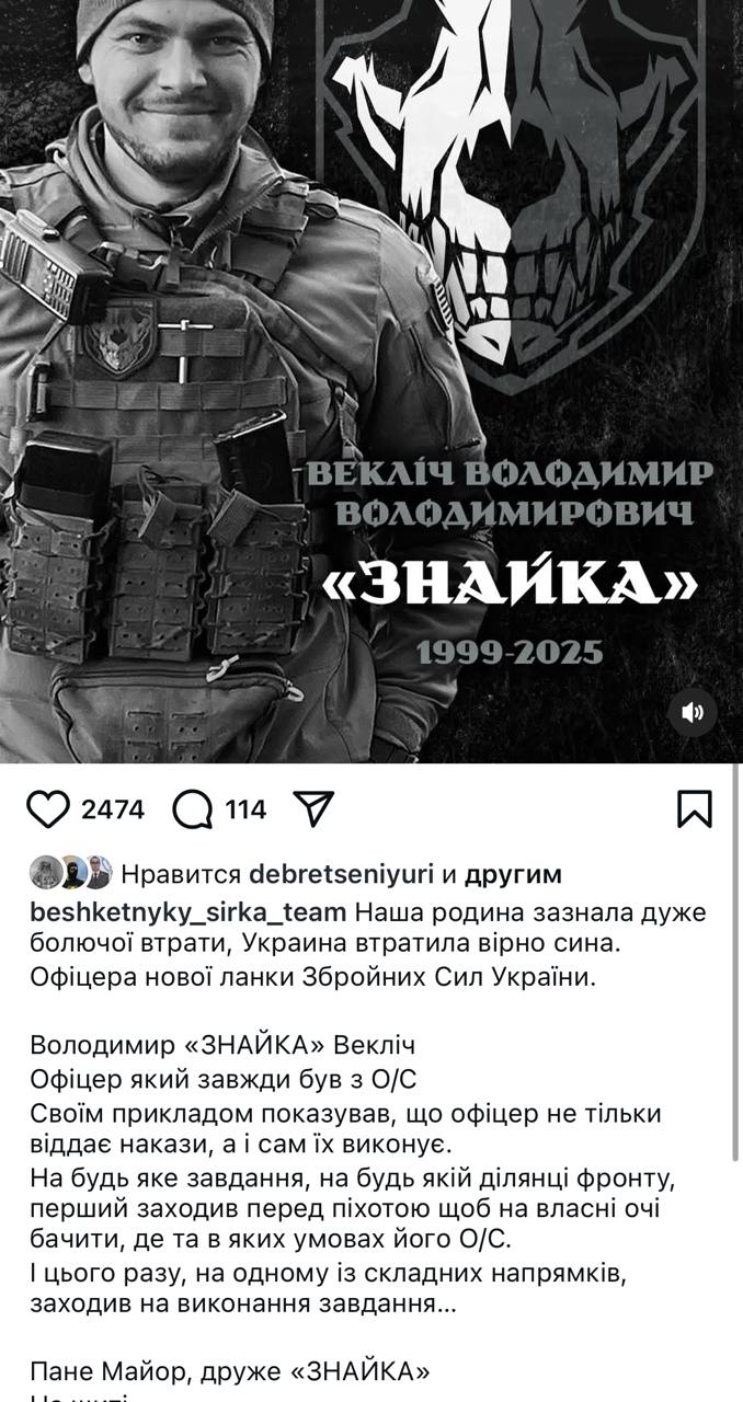 Майор из разведподразделения "Бешкетники Сірка" 92й ОМБР. В первый раз сумел спастись от френдлифаера от "интернационалистов-наёмников" из заградотряда под Купянском, а вот во второй уже не повезло.