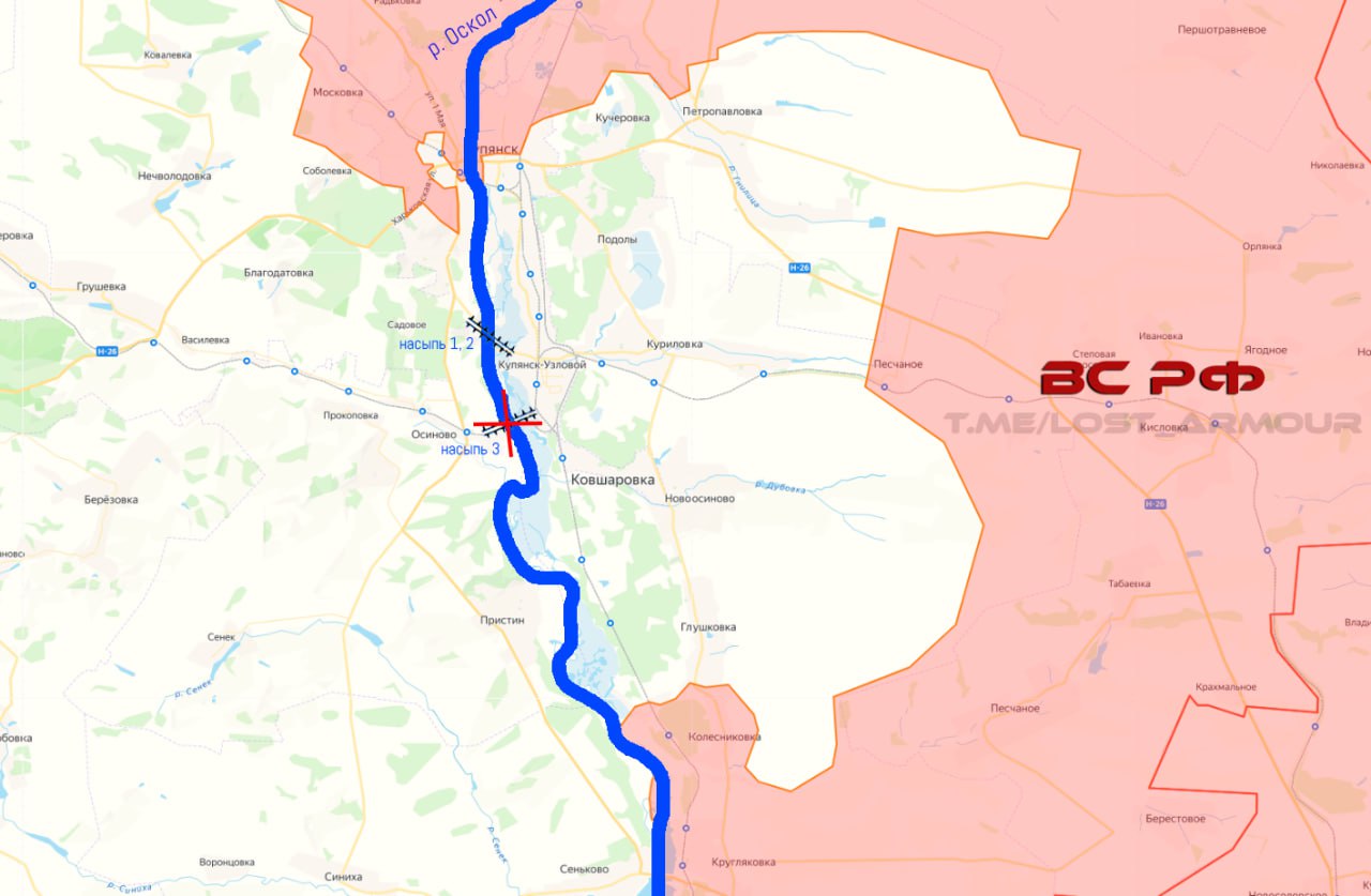 На Купянском направлении группировка ВСУ на левом берегу Оскола также "висит" на нескольких переправах в районе Купянска-Узлового, одна из которых сегодня была разрушена высокоточным ударом ВС РФ.
