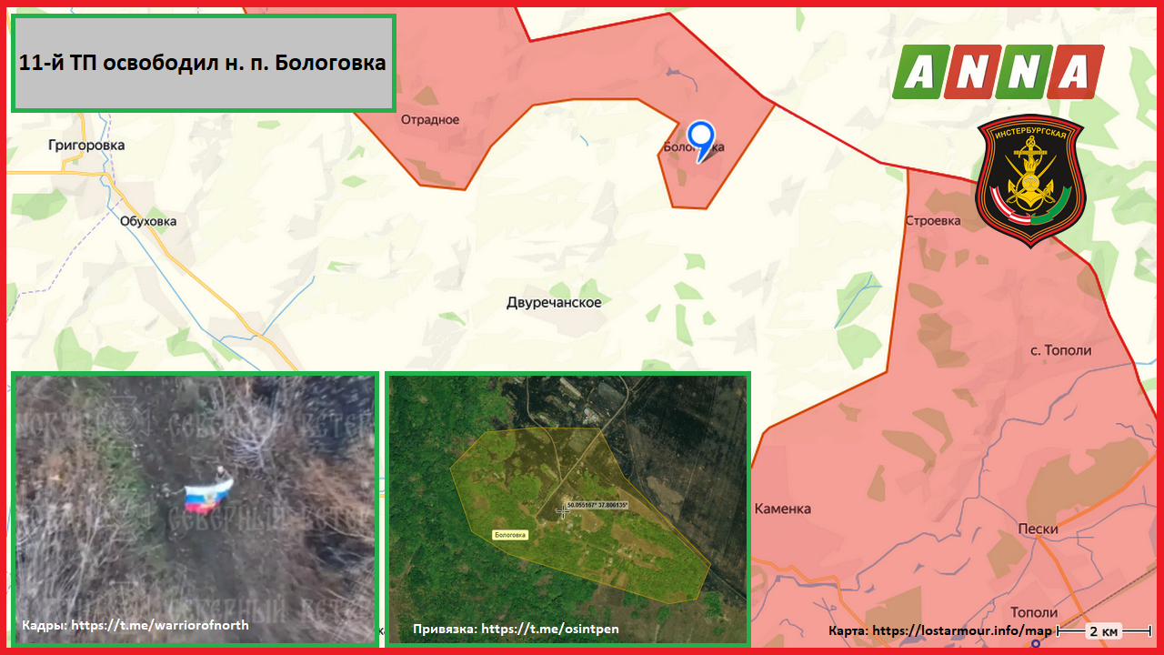 Освобождённый военными из 11-го танкового полка населённый пункт Бологовка на спутниковом снимке (с) ANNA-NewsКак уточняет связанный с группировкой войск «Север» канал «Северный ветер», населённый пункт был освобождён штурмовиками из 11-го танкового полка.