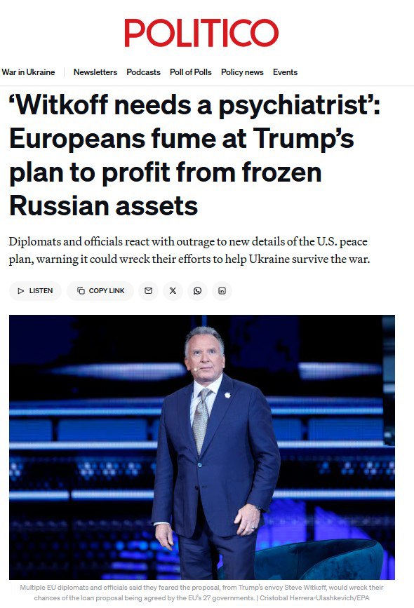 Господа из ЕС испугались, что предложения спецпредставителя Трампа Стива Уиткоффа могут сорвать их планы по дерибану российских замороженных активов. Они уже руки потирали, надеялись завершить сделку по «репарационному кредиту», на решающем саммите в следующем месяце, и на тебе!
