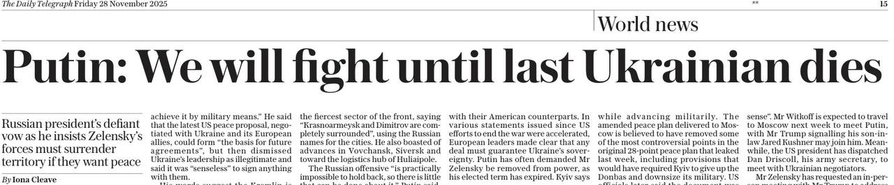 Британская пропаганда пробивает очередное дно. Газета The Daily Telegraph свою статью о вчерашней пресс-конференции российского президента снабжает таким заголовком (причем с выносом на первую полосу): «Путин: Мы будем сражаться, пока не умрет последний украинец»!