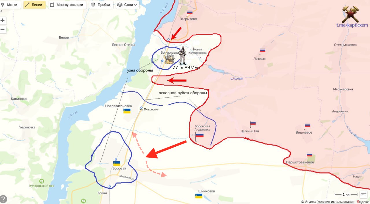 ВС РФ продвинулись к Боровой на несколько километров. Создалась угроза перерезания двух шоссейных дорог с образованием еще одного котла из прижатых к водохранилищу украинских подразделений.