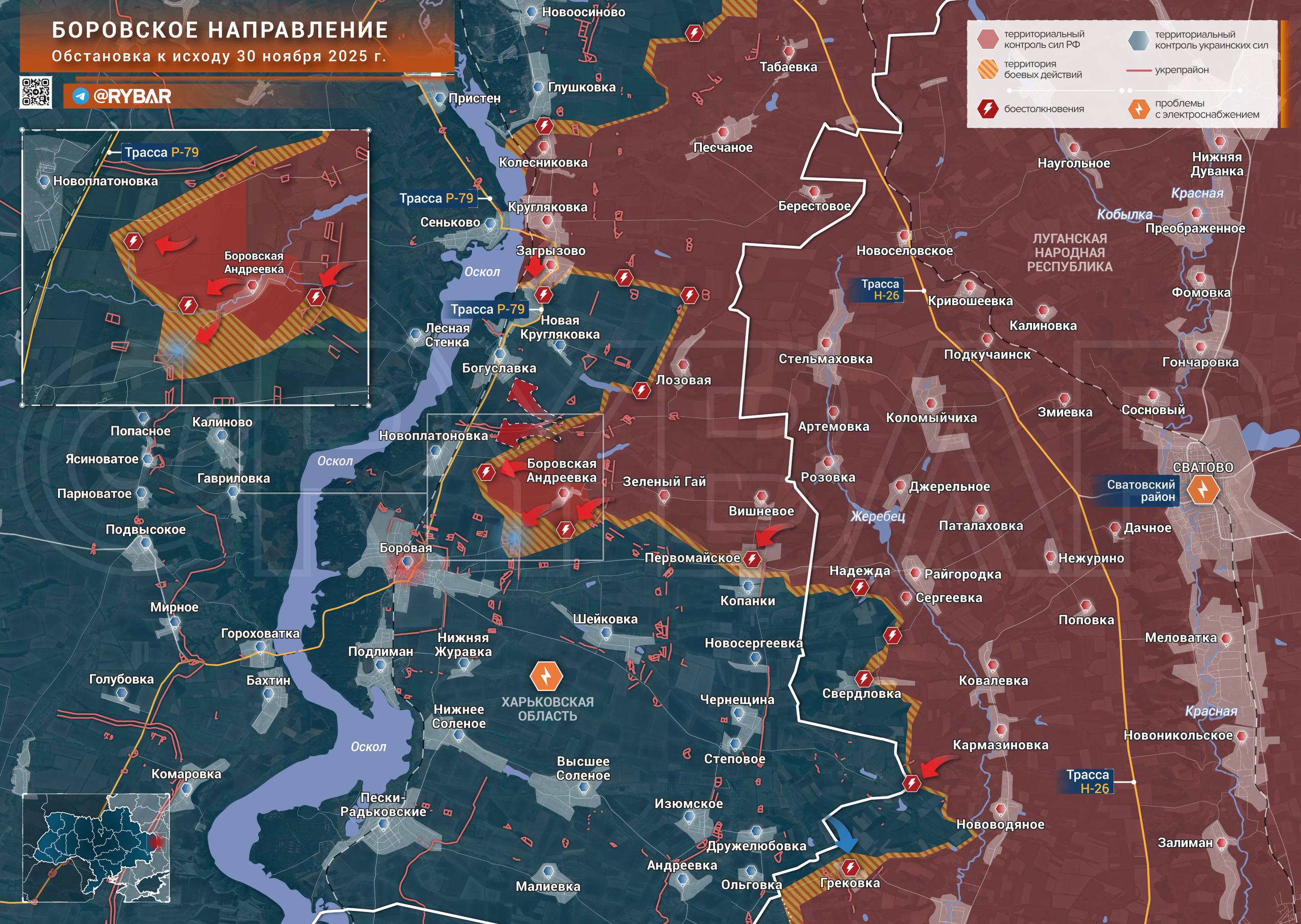 Любопытно, что с участка севернее ранее всплыли кадры атаки российских подразделений на Боровую в обход Малой Кругляковки. По нашей информации это архив, и присутствия российских войск в Богуславке нет.