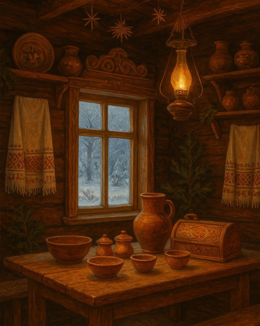 Лучшие вышитые полотенца, которые весь год лежали в сундуке, вешали на стены. Каждая вышивка — знак, который приносит в дом порядок, защиту и радость. Расписные миски, хлебницы и солонки ставили на видное место: так подчёркивали уважение к труду и достатку, «чтоб в доме всё ладилось».