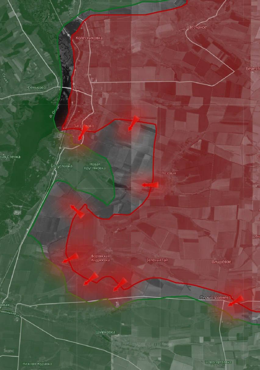 Параллельно с этим российские силы наступают южнее. Некоторое время назад они взяли цепь укреплений на подступах к Новоплатоновке. После этого ВС РФ начали развивать атаки дальше в сторону Оскола по проходящей здесь трубе газопровода, стремясь закрепиться в окрестностях газокомпрессорной станции, что ставит под угрозу коммуникации ВСУ на левом берегу Оскола. ВСУ безуспешно пытаются не позволить российским военным закрепиться на позициях – на данном участке продолжаются ожесточенные бои»