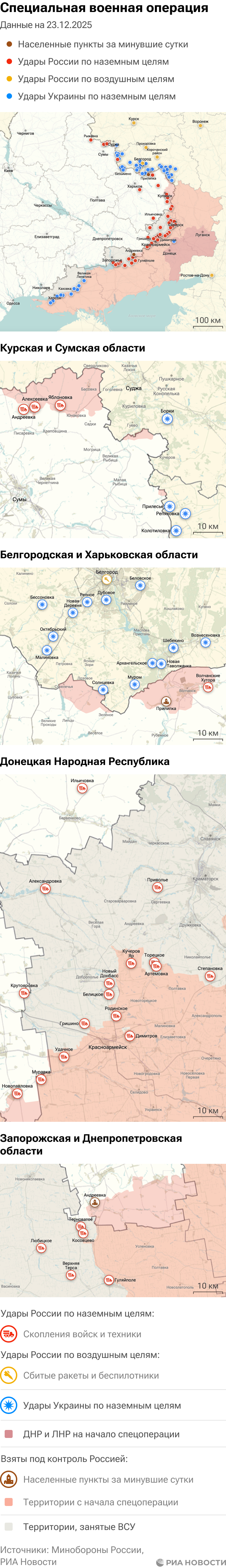 Российская армия с 24 февраля 2022 года проводит на Украине специальную военную операцию. Ее главной целью является помощь Донецкой и Луганской народным республикам, на территории которых с 2014 года не прекращались обстрелы. Перед российскими военными поставлена задача минимизировать потери личного состава и мирного населения при выполнении боевых заданий.Данные Минобороны и администраций новых регионов на 23 декабря 2025 года