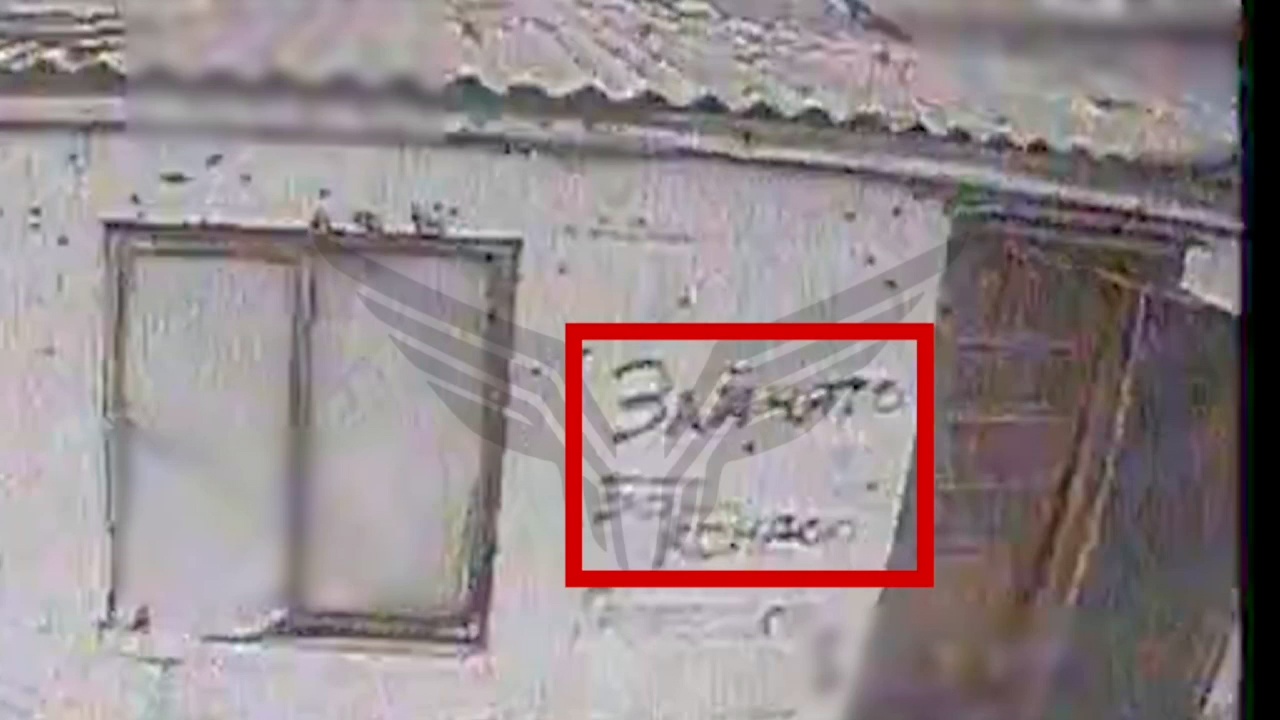 На опубликованных кадрах видно одноэтажное строение с поврежденной кровлей, а также прилегающую территорию с хозяйственными постройками и ограждениями. Видеозапись включает как обзорные кадры с воздуха, так и фрагменты, снятые с бортов камер при приближении дронов к зданию, на котором различима надпись на стене, ставшая одним из ориентиров при разведке цели.