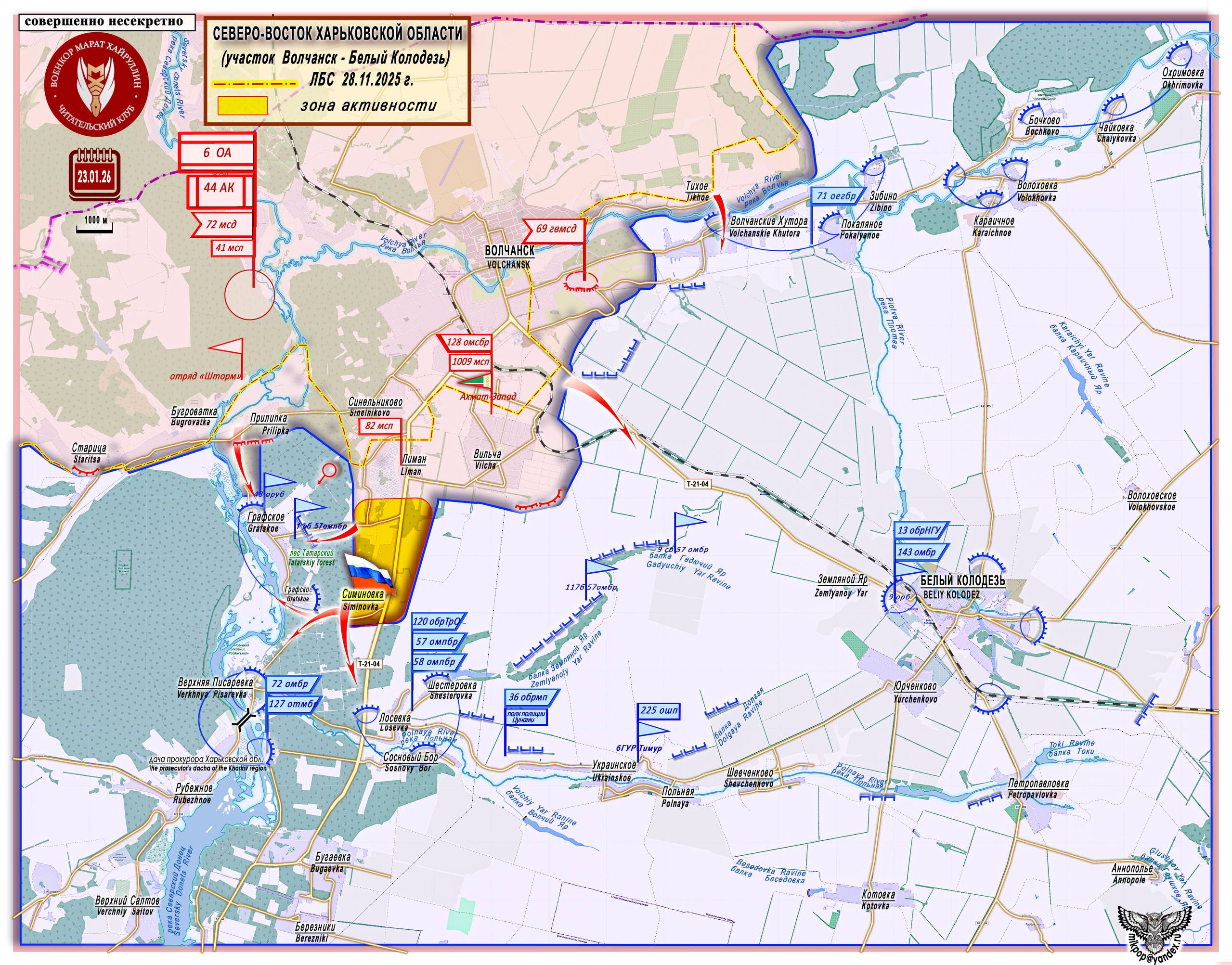 23 января 2026 г. был установлен контроль над н.п. Симиновка (50°1252 с. ш. 36°5340 в. д. - население 330 чел. в 2001г., до 2016 н.п. Червоноармейское Первое).