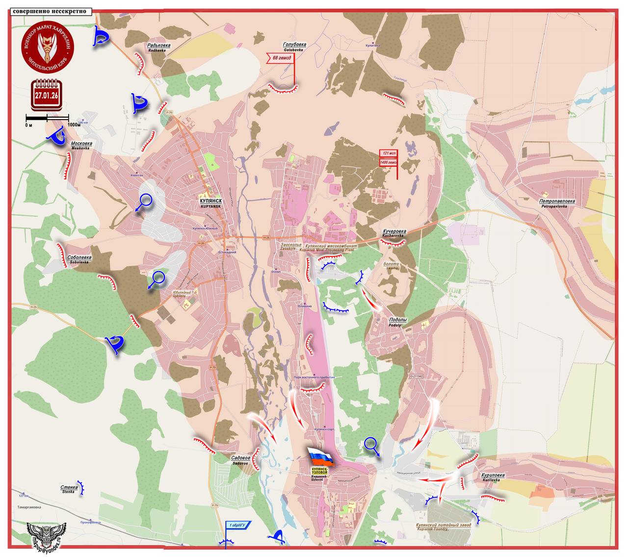 В числе освобожденных назван и поселок городского типа Купянск-Узловой (49°3931 с. ш. 37°3901 в. д., - население в 2001 г. 9790 чел., в 2025 г. около 800 чел.).