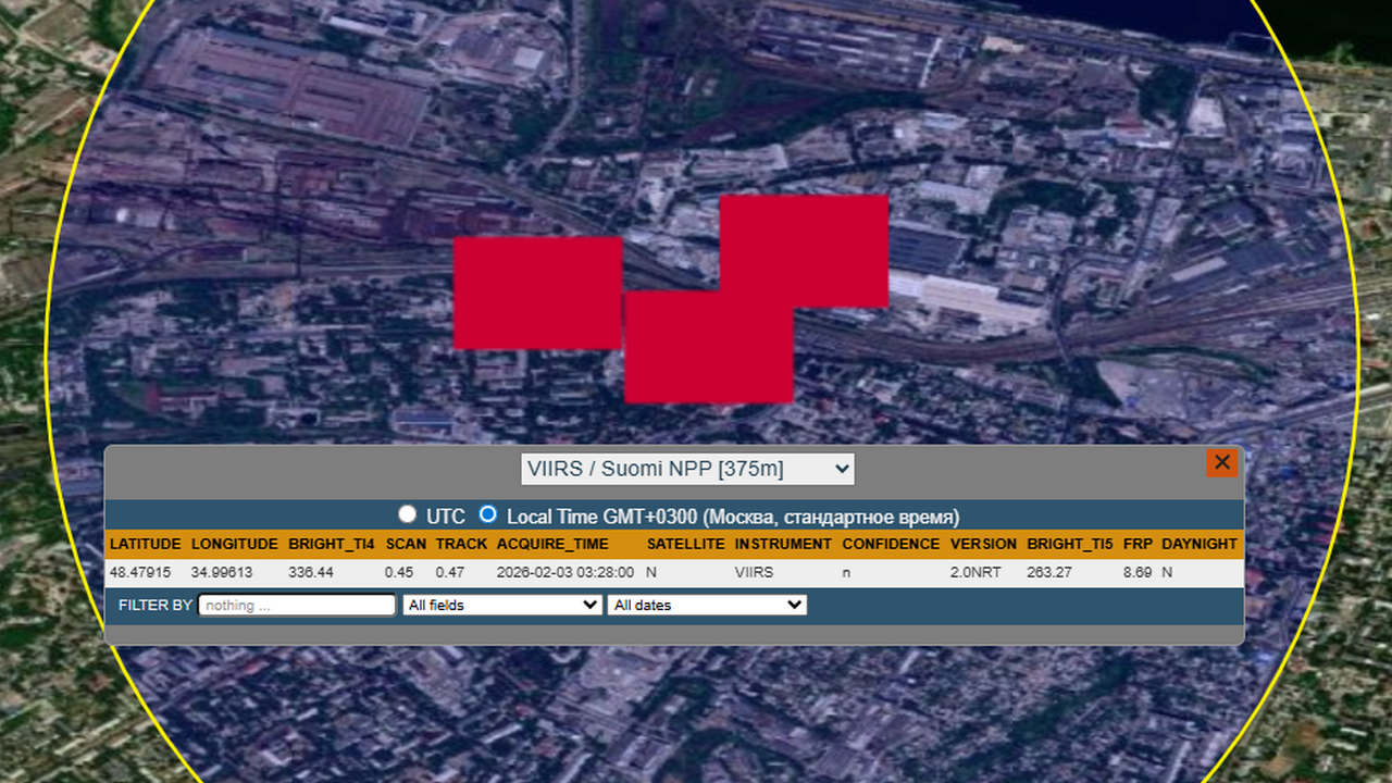 Отметки о пожаре в районе железнодорожной станции в Днепропетровске (с) FIRMSПо данным противника, для нанесения поражения по целям в Днепропетровске были использованы баллистические ракеты ОТРК «Искандер-М» и ударные беспилотники «Герань-2».