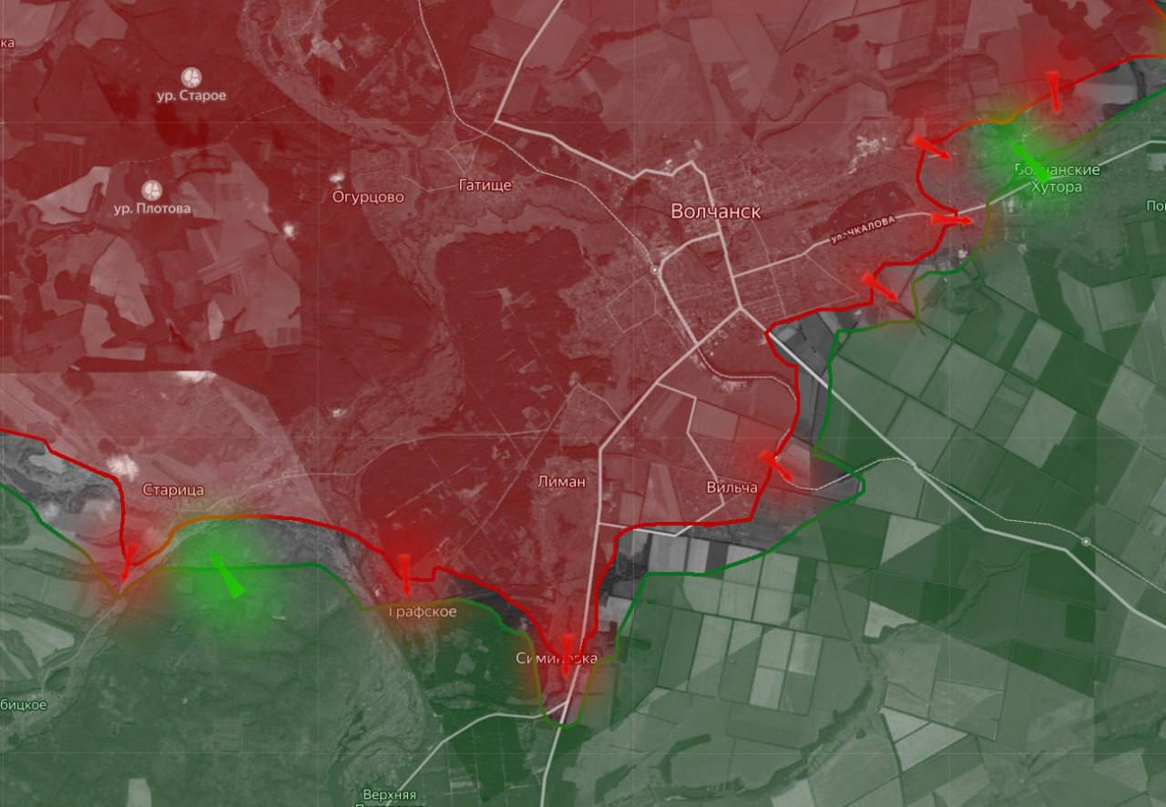 «На Южно-Слобожанском направлении российские войска продвинулись в лесном массиве возле Старицы. Также продвижение ВС РФ фиксируется юго-западнее Симиновки, где они захватили позицию 120 обр ТРО, и в районе Волчанских Хуторов».