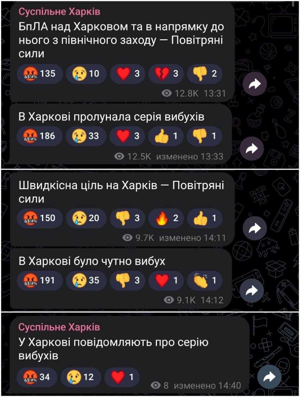 Харьков. В течении часа прозвучало несколько серий взрывов. Сообщают, что отработали «Герани», а также баллистика.