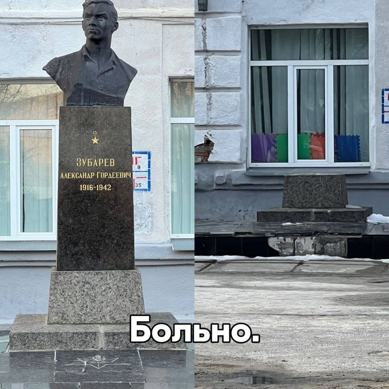 Фашисты прошлой ночью на ХТЗ снесли памятник Герою Советского Союза Зубареву Александру Гордеевичу, который умер в 1942, преподавая детям до последних минут жизни. Пока не прилетела фашистская ракета в здание школы номер 88.