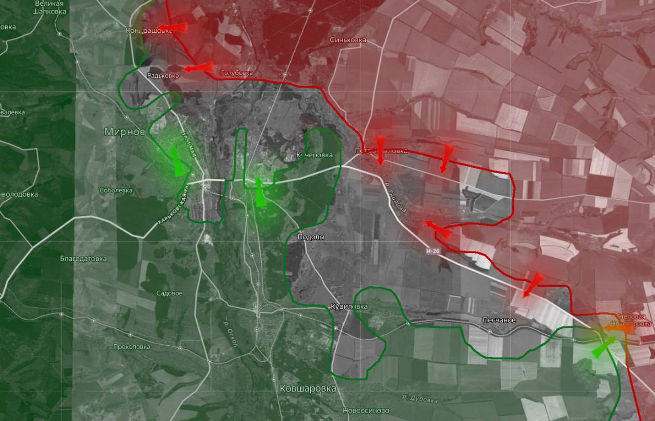 «На Купянском направлении российские войска продвинулись на участке севернее Кучеровки. Идут бои за промзону и восточнее Петропавловки. В районе Песчаного – позиционные бои».