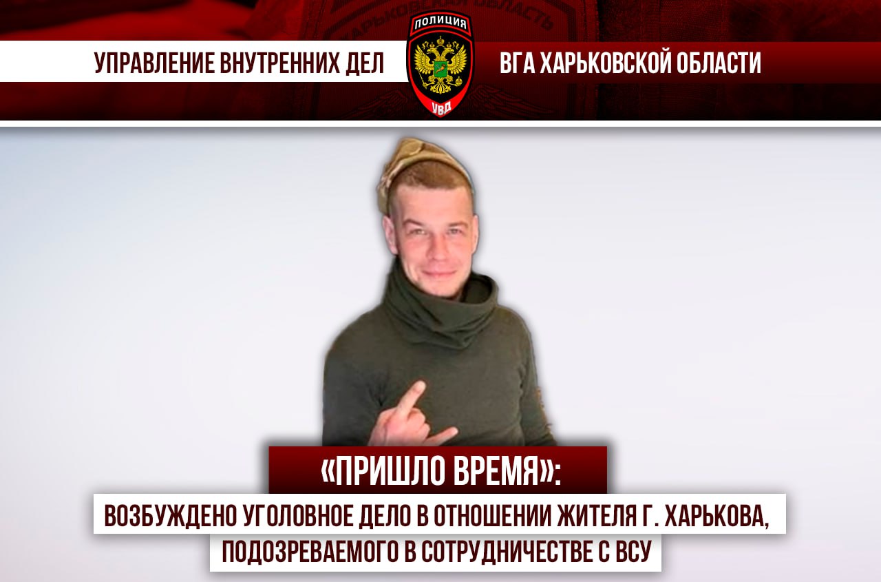 © Управлением внутренних дел ВГА Харьковской области возбуждено уголовное дело в отношении гражданинаВремя Сергея Андреевича, 06.07.1992 года рождения. Он подозревается в совершении преступления, предусмотренного ст. 276.1 УК РФ (оказание помощи противнику в деятельности, заведомо направленной против безопасности Российской Федерации).
