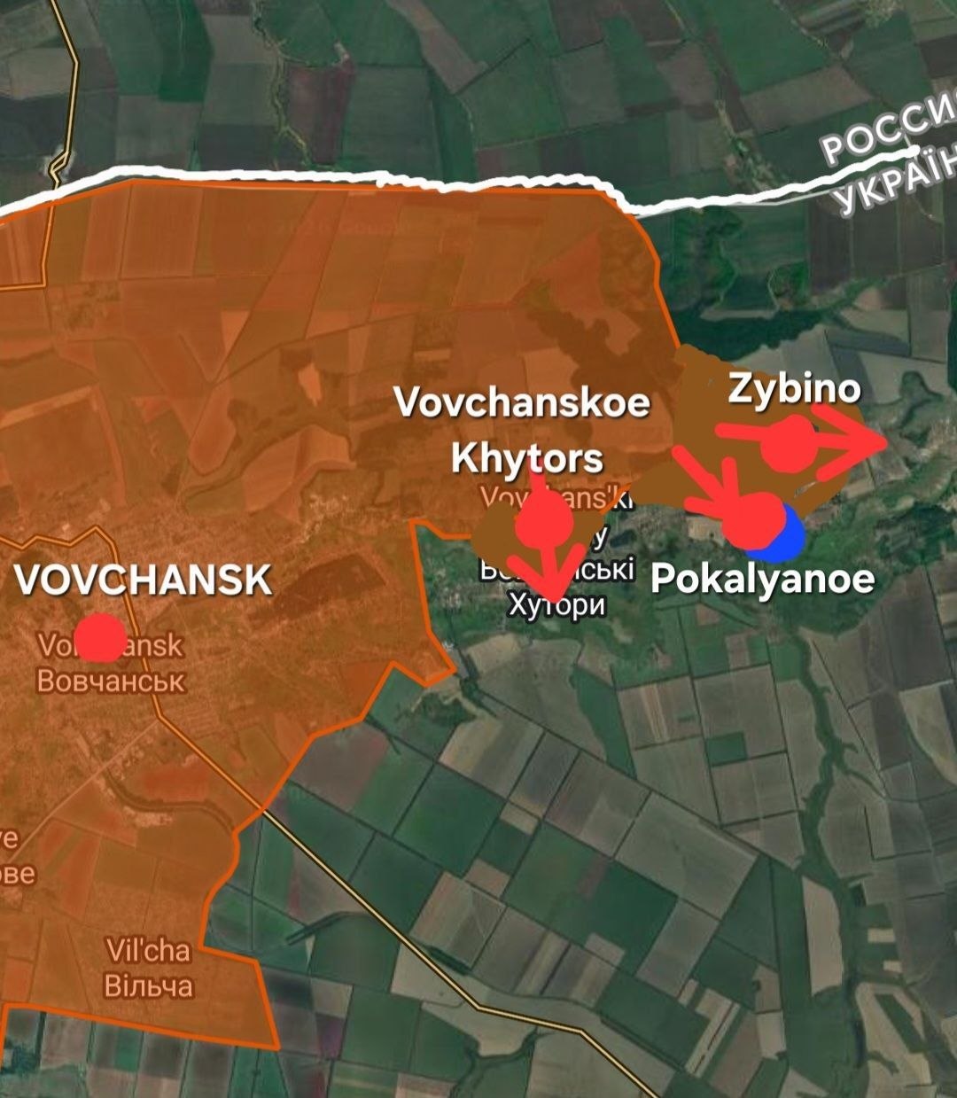 1: После освобождения Вовчанского Хутора российскими войсками последние украинские части 113-й территориальной бригады и 157-й механизированной бригады отступили дальше на восток к Покаляно и Жыбино — опорным пунктам, которые сразу же подверглись новым атакам российских войск 69-й и 71-й гвардейских мотострелковых дивизий при поддержке авиации.