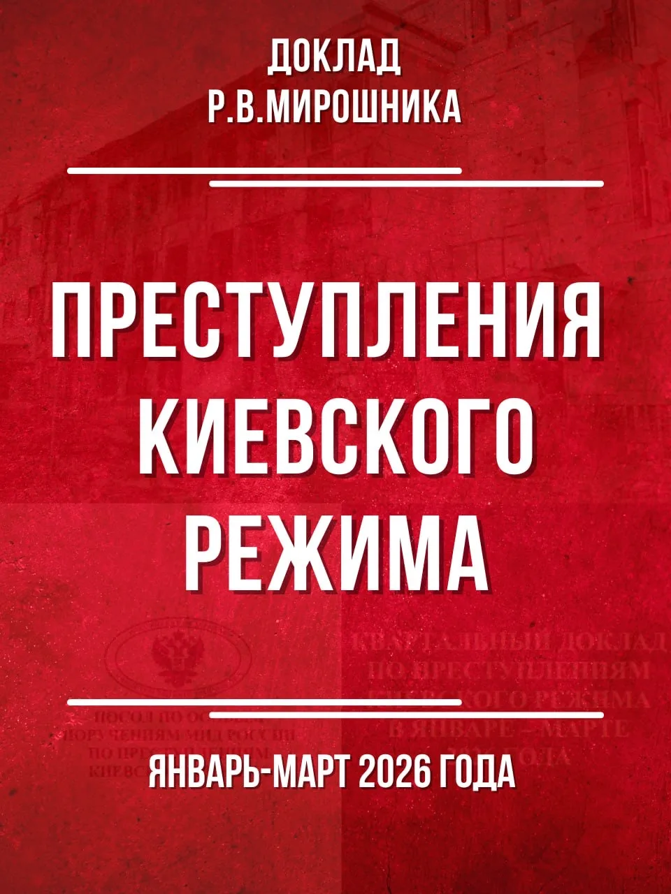 Публикуем квартальный доклад по преступлениям киевского режима в январе-марте 2026 года, подготовленный Послом по особым поручениям МИД России Р.В.Мирошником.