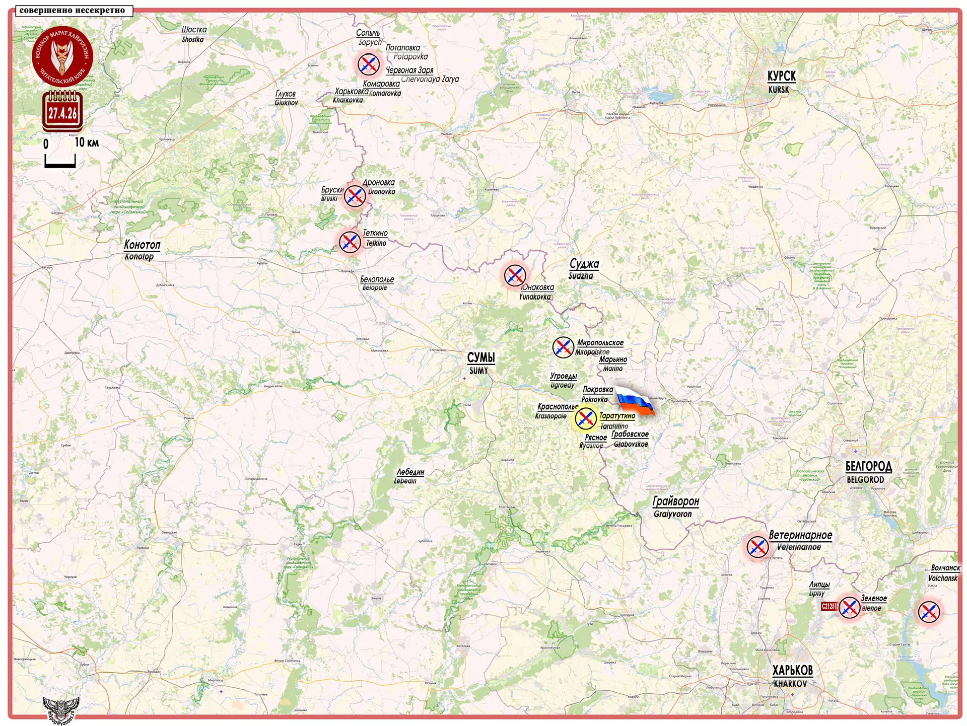 Реализуя этот оперативно-тактический замысел, после продвижения на Харьковском направлении, 27 апреля активизировался центральный участок Сумского направления. Подразделения 34 отдельной гвардейской мотострелковой бригады взяли под контроль н.п. Таратутино (50°4346 с. ш. 35°2242 в.д. - население 74 чел. в 2001 г.).